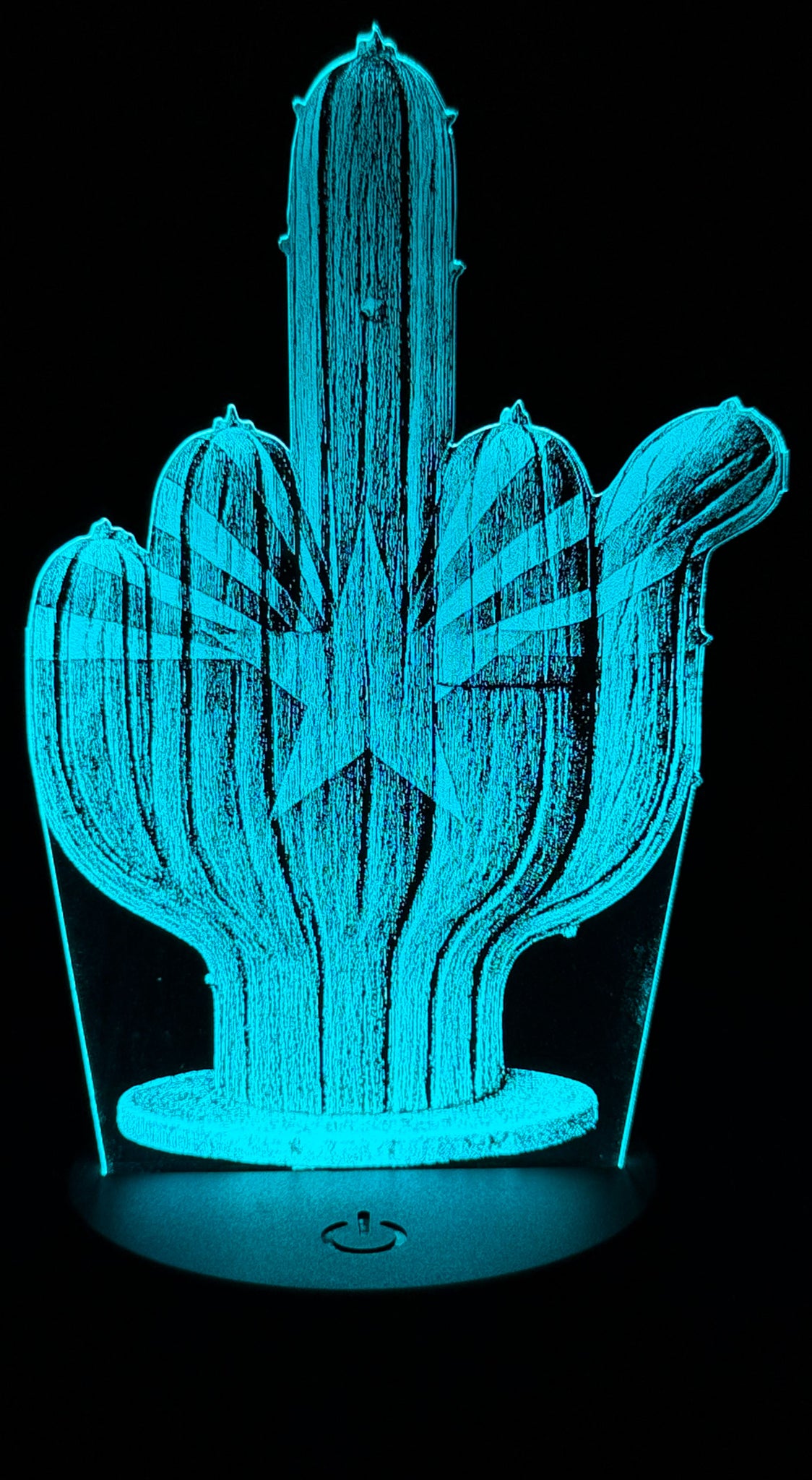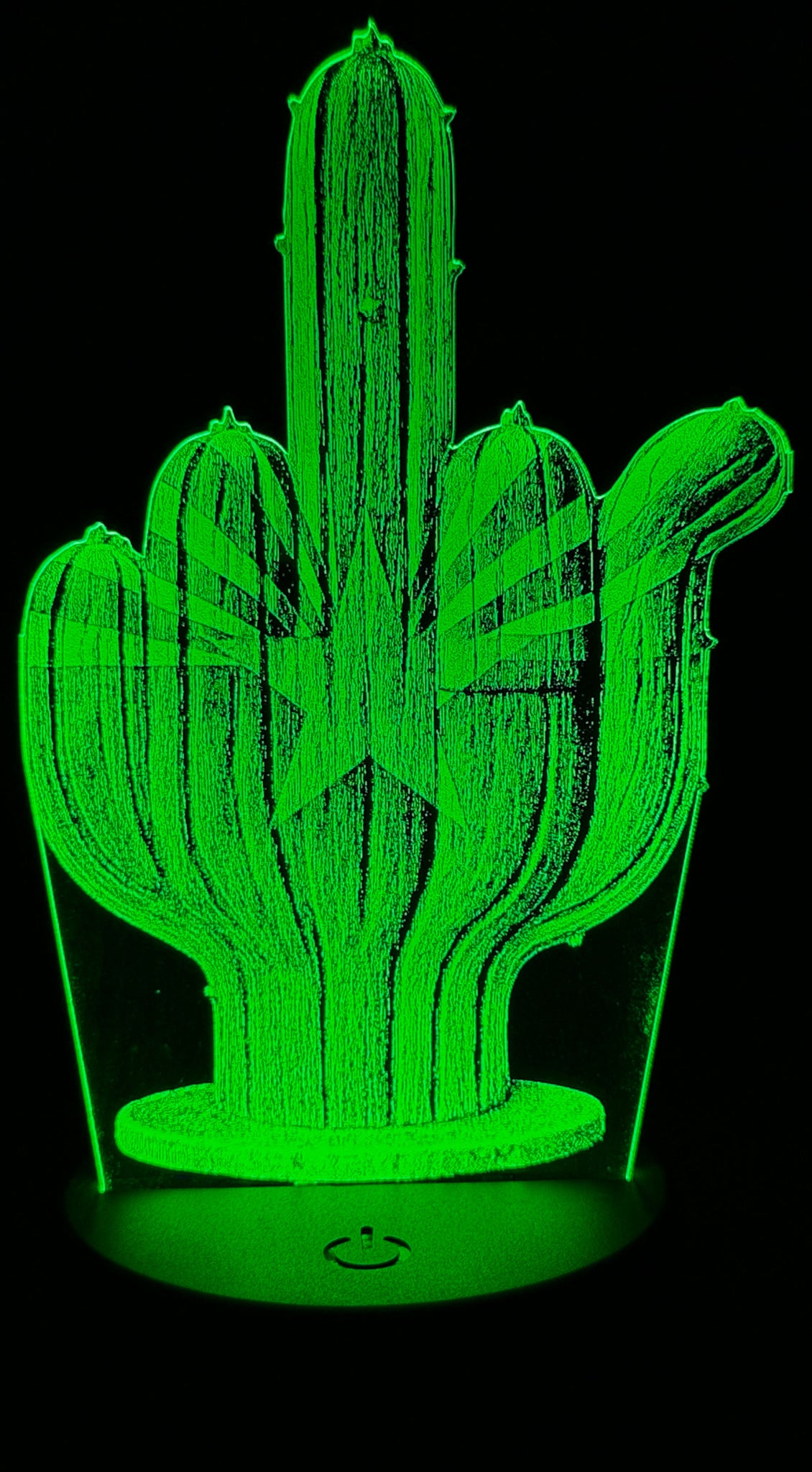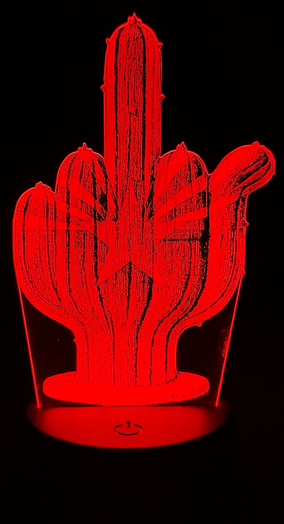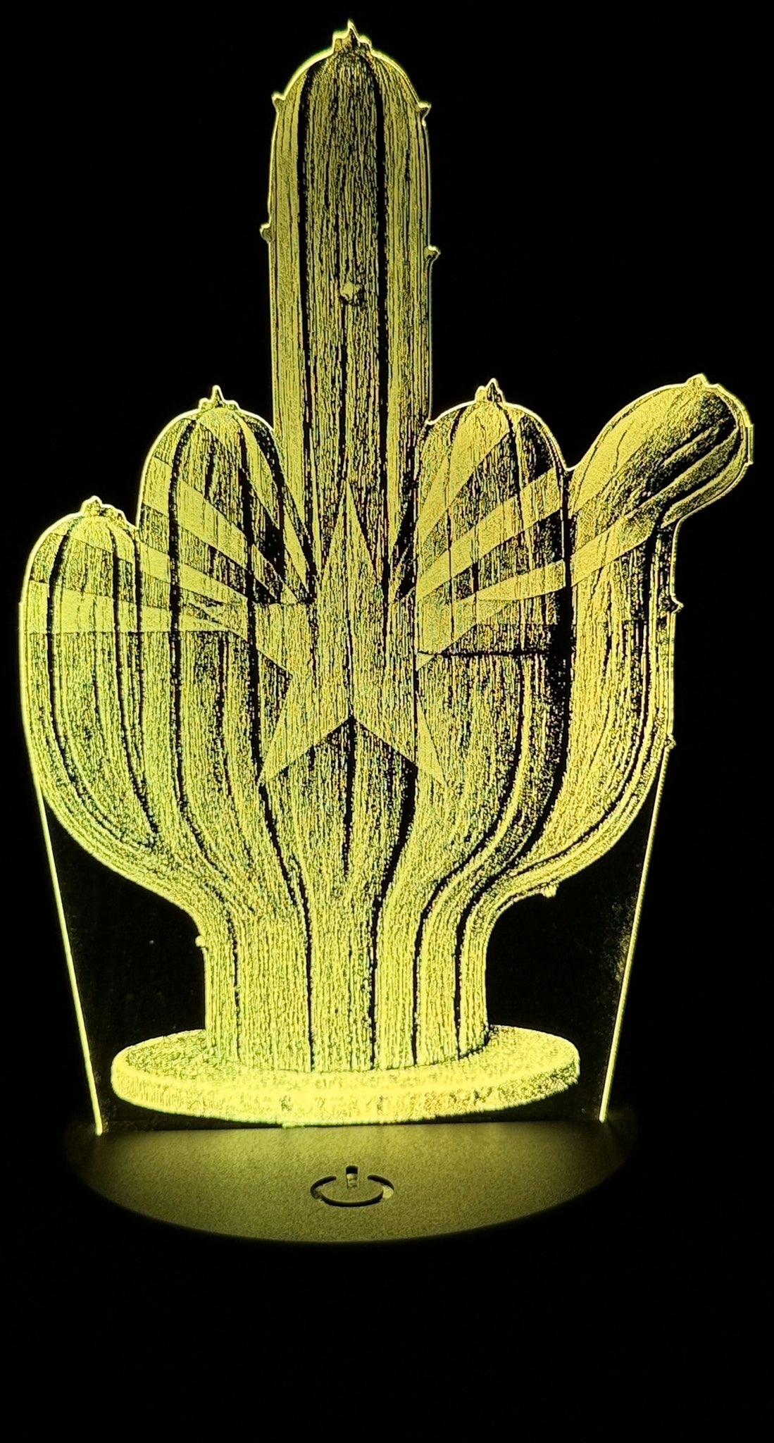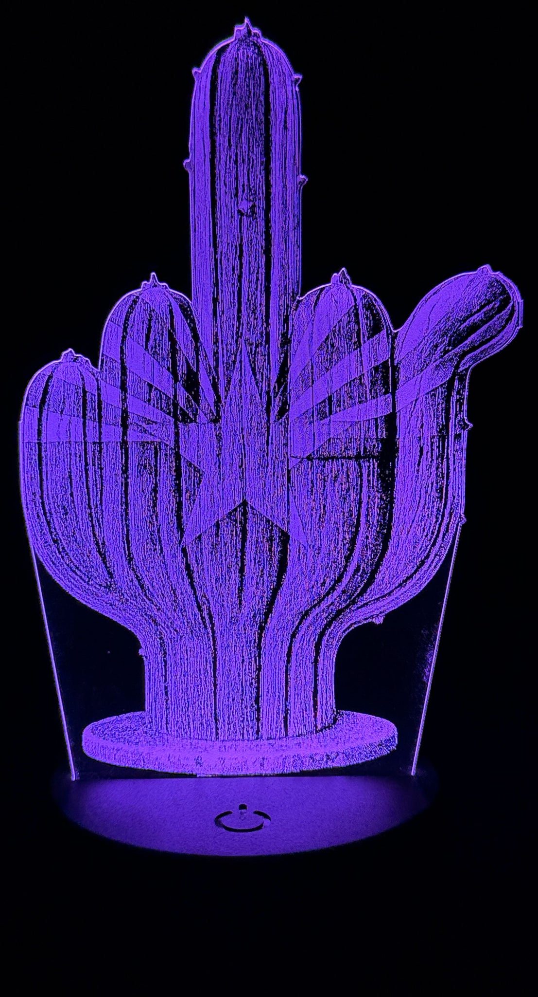 Celebrate the spirit of the Southwest with this edge-lit acrylic lamp featuring a stylized cactus etched with the iconic Arizona flag. With its central copper star and radiating lines, this design blends desert resilience with state pride—and a dash of rebellious humor. Illuminated by vivid LED lighting, the cactus stands tall with unmistakable attitude, making it a standout piece for any space.