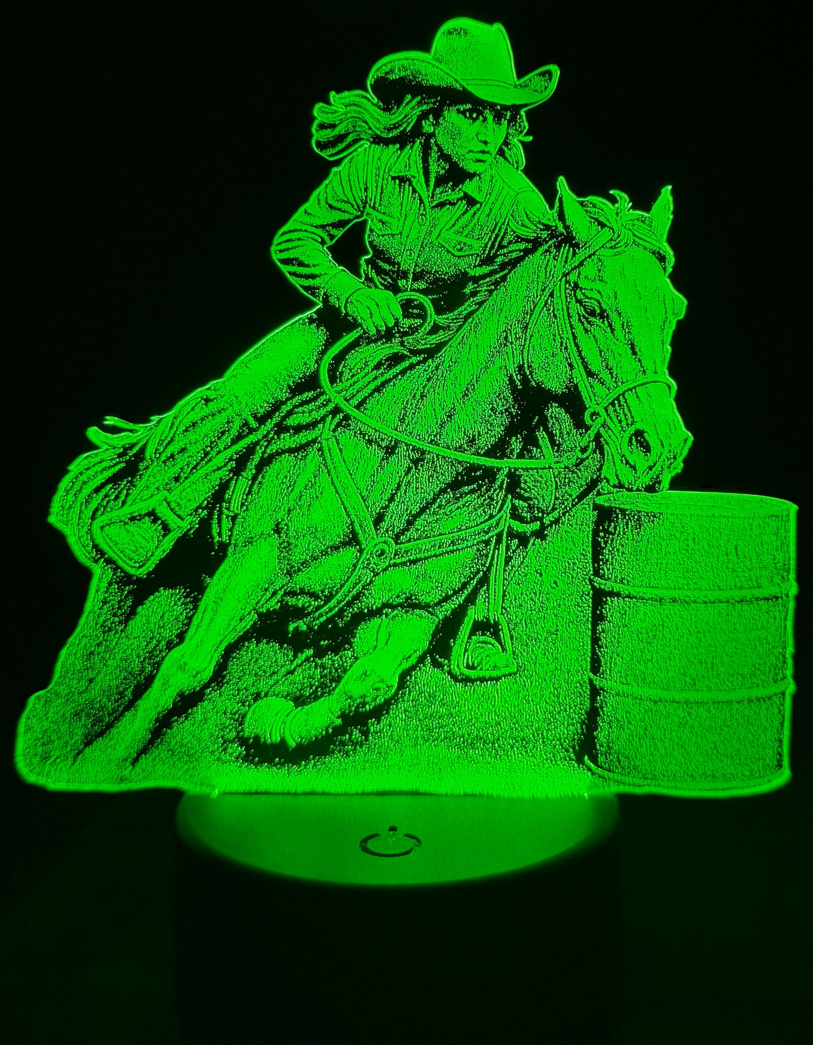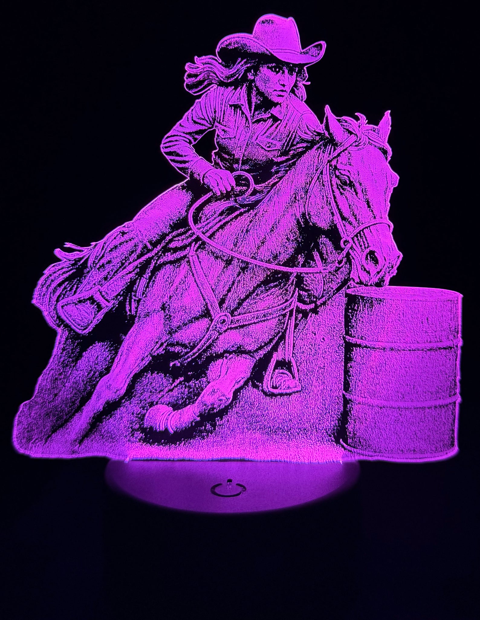 Celebrate the thrill of the rodeo with this handcrafted edge-lit acrylic lamp featuring a high-action barrel racing scene. Etched with precision and illuminated by vibrant LED lighting, this piece captures the intensity of a rider and horse leaning into a tight turn around the barrel. From the cowboy hat to the detailed reins and tack, every element is rendered with striking realism.