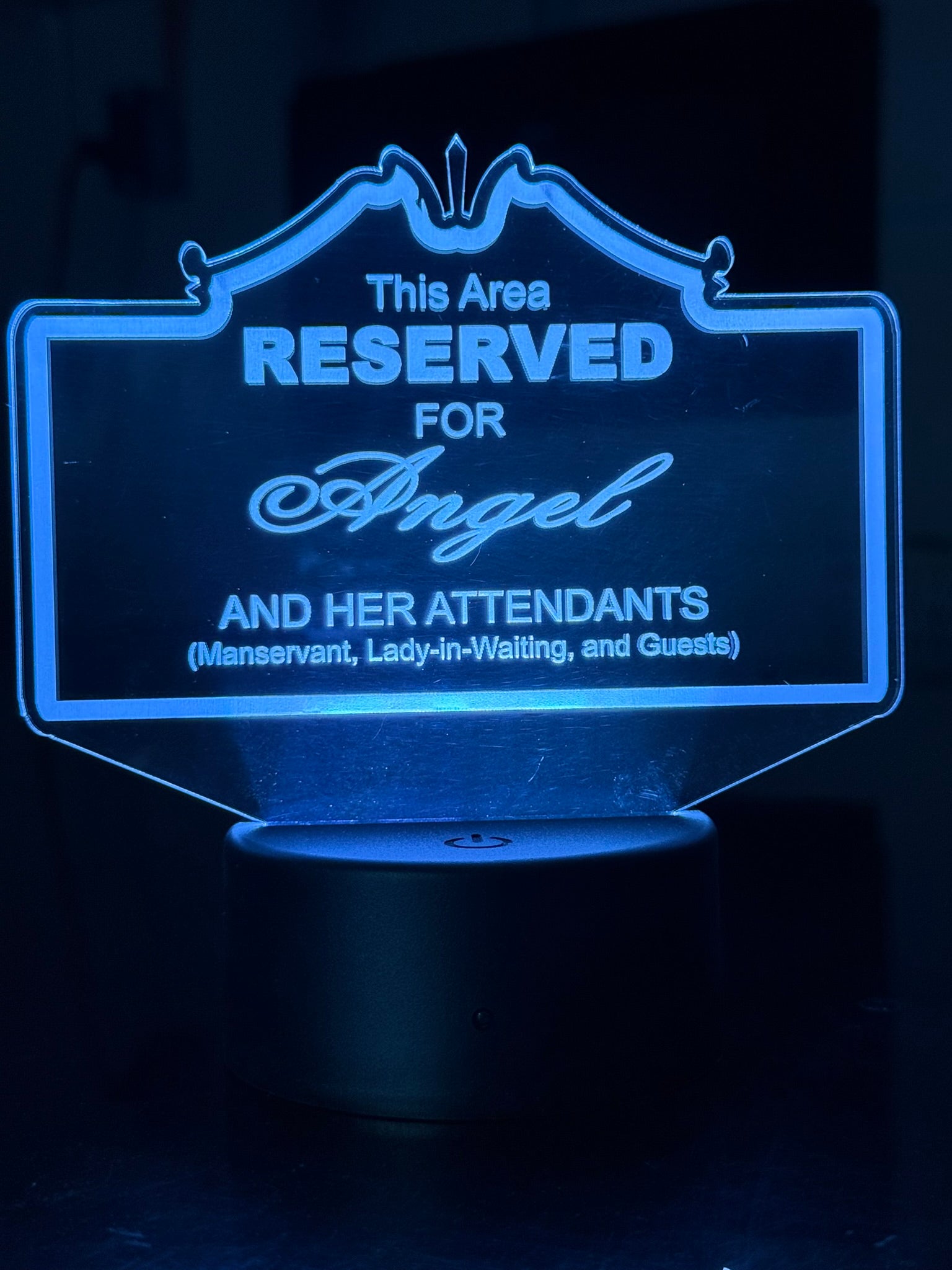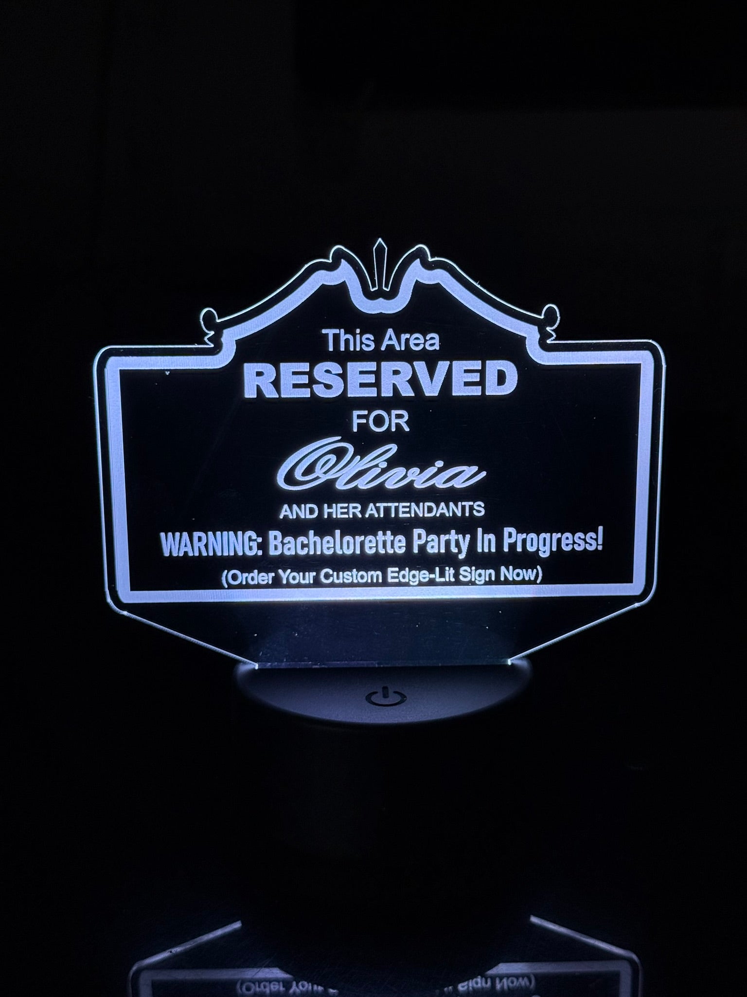 Create a one‑of‑a‑kind custom edge‑lit acrylic sign, engraved with your message, name, or event and illuminated with vibrant LED light. Whether it’s a bachelorette party, reserved seating, man cave, or special occasion, this sign is fully customizable in shape, layout, and wording—designed to match your vision and make a glowing statement.