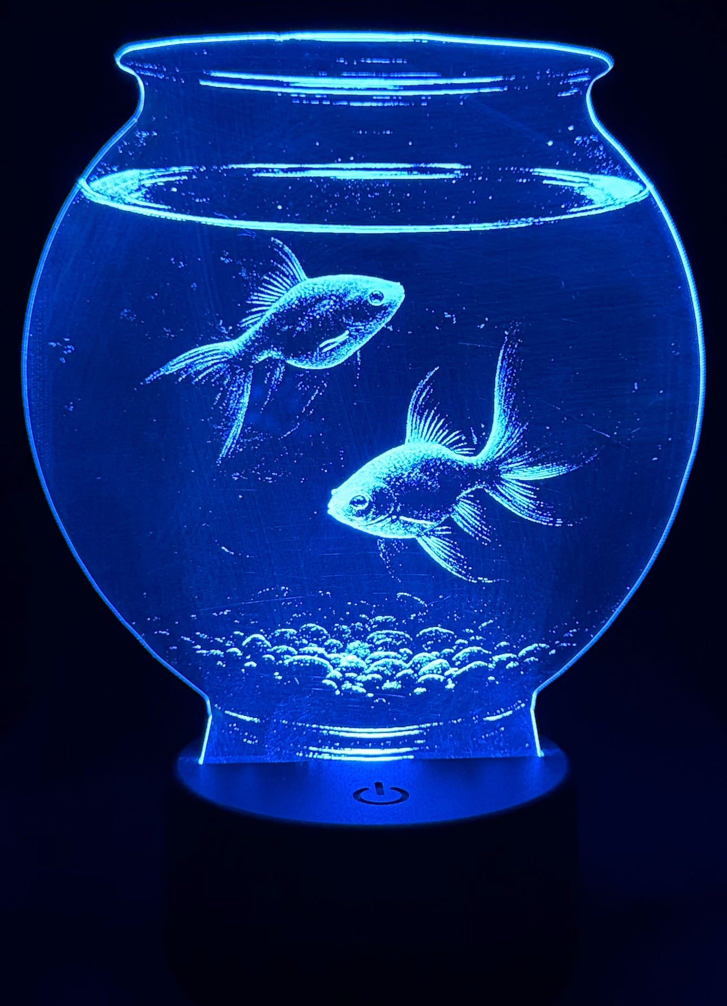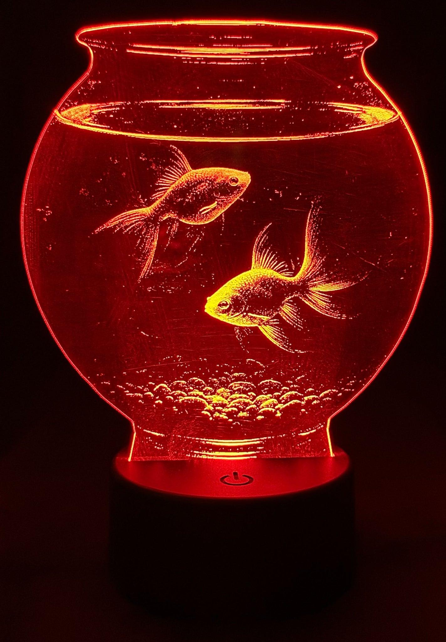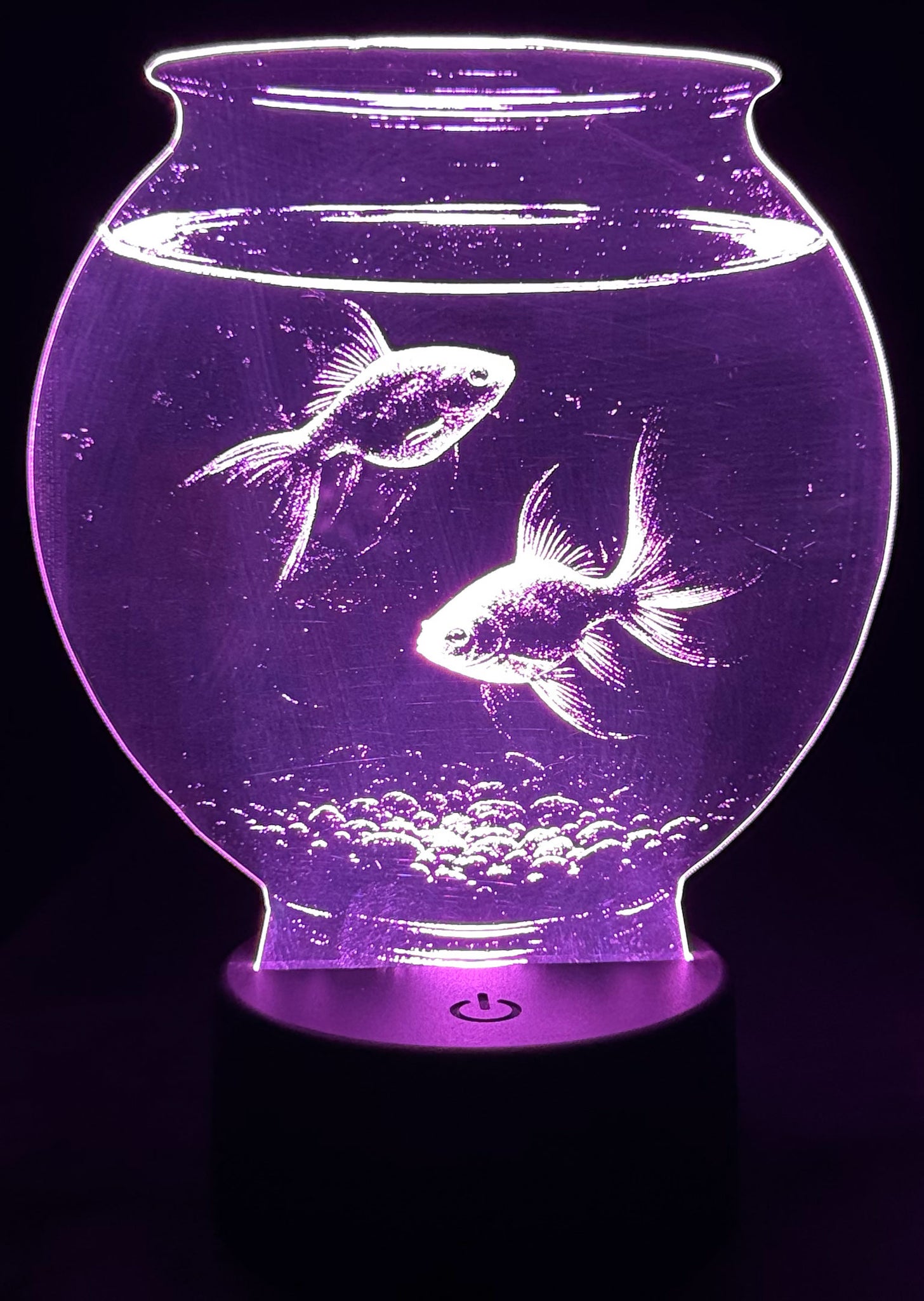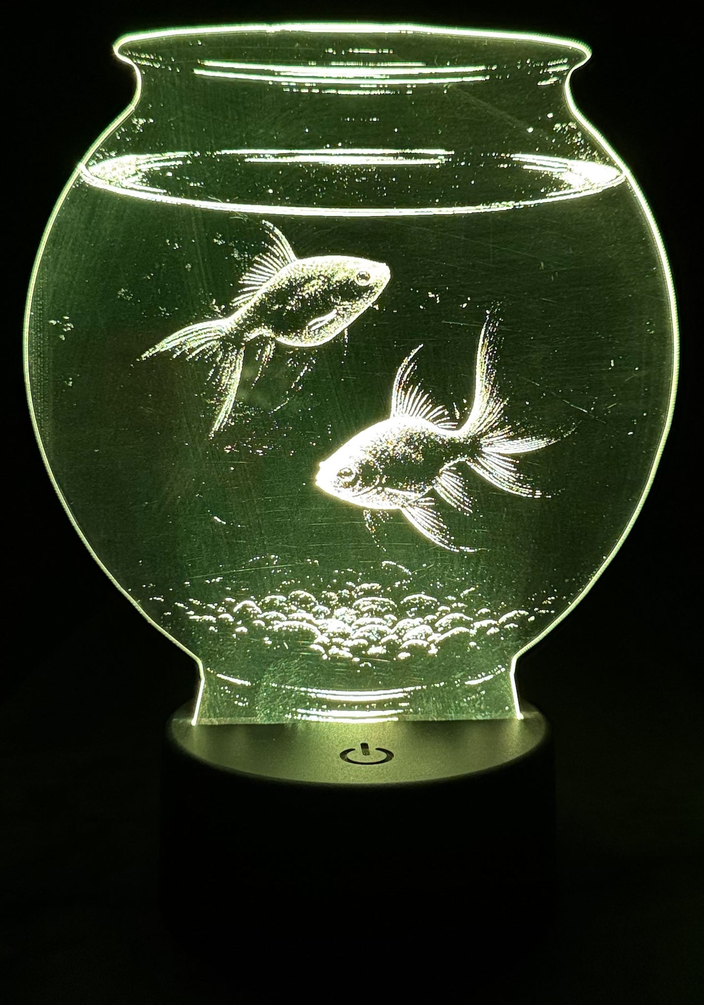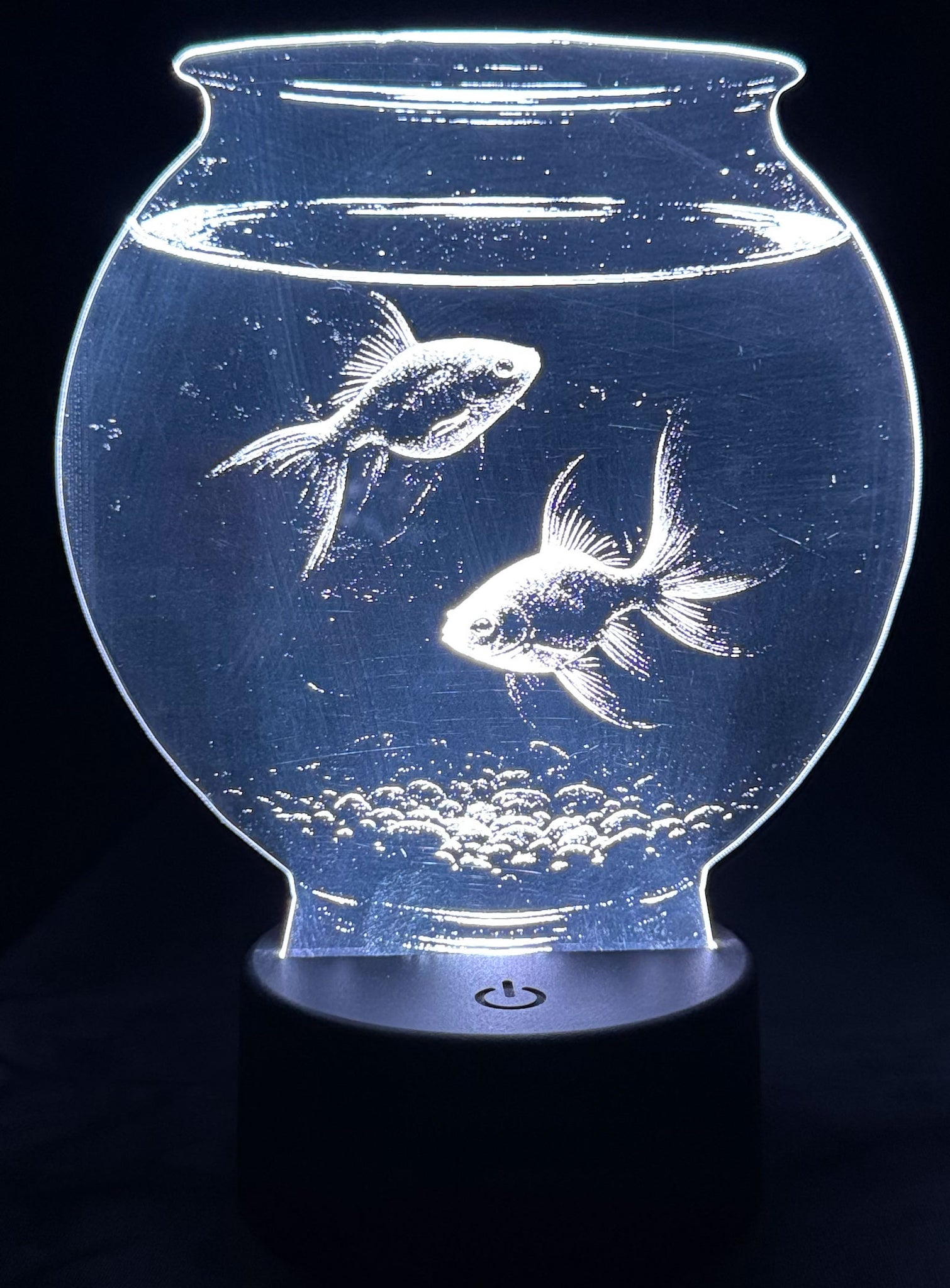 Bring the peaceful charm of an aquarium to your space with this edge-lit acrylic lamp featuring a beautifully etched goldfish bowl scene. Two graceful fish swim among rising bubbles, captured in stunning detail and illuminated by vibrant LED lighting. The glowing effect creates a soothing ambiance, perfect for pet lovers, aquatic enthusiasts, or anyone seeking a touch of tranquility.