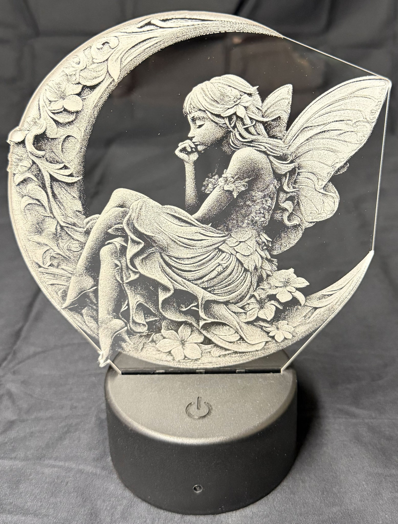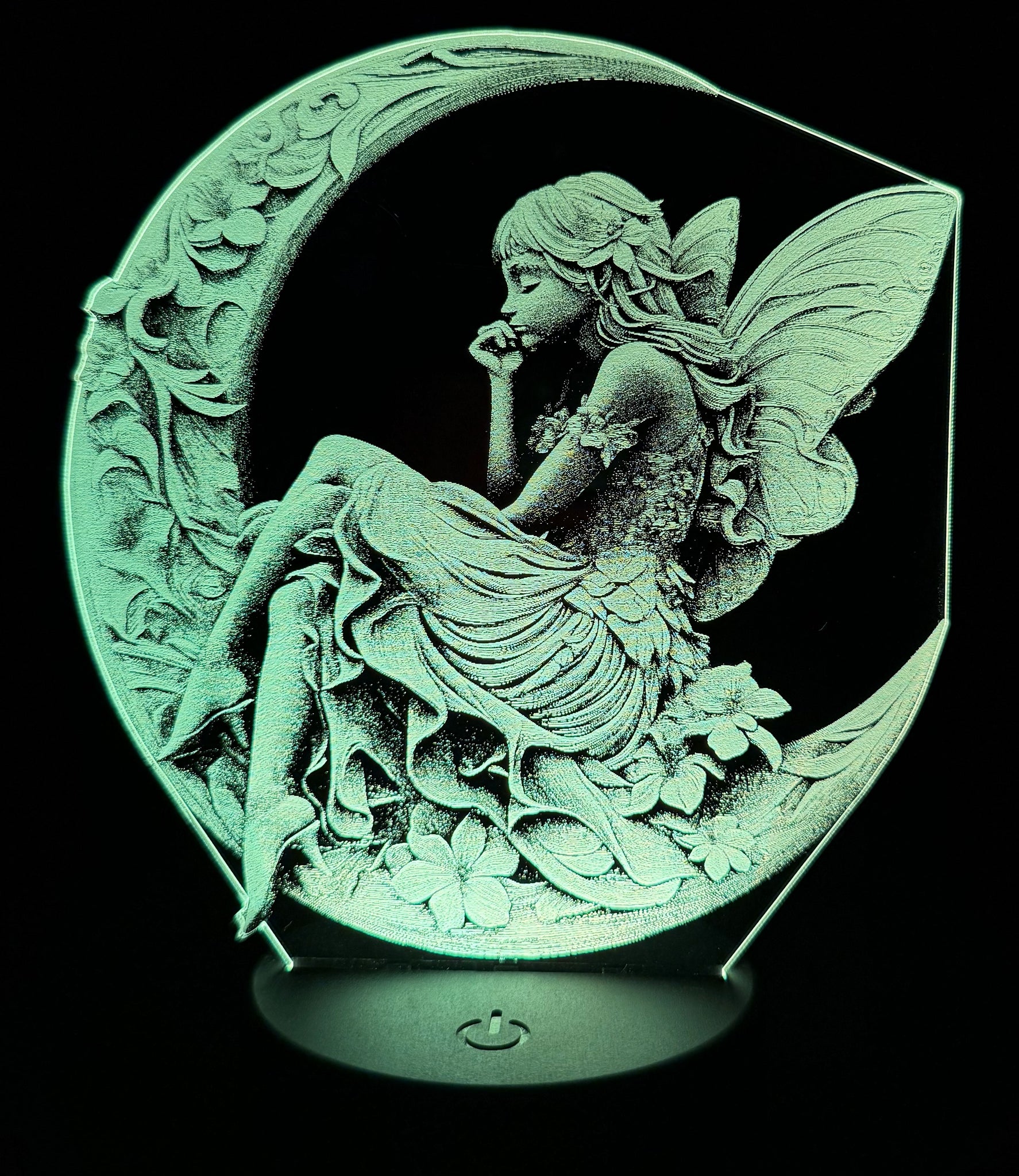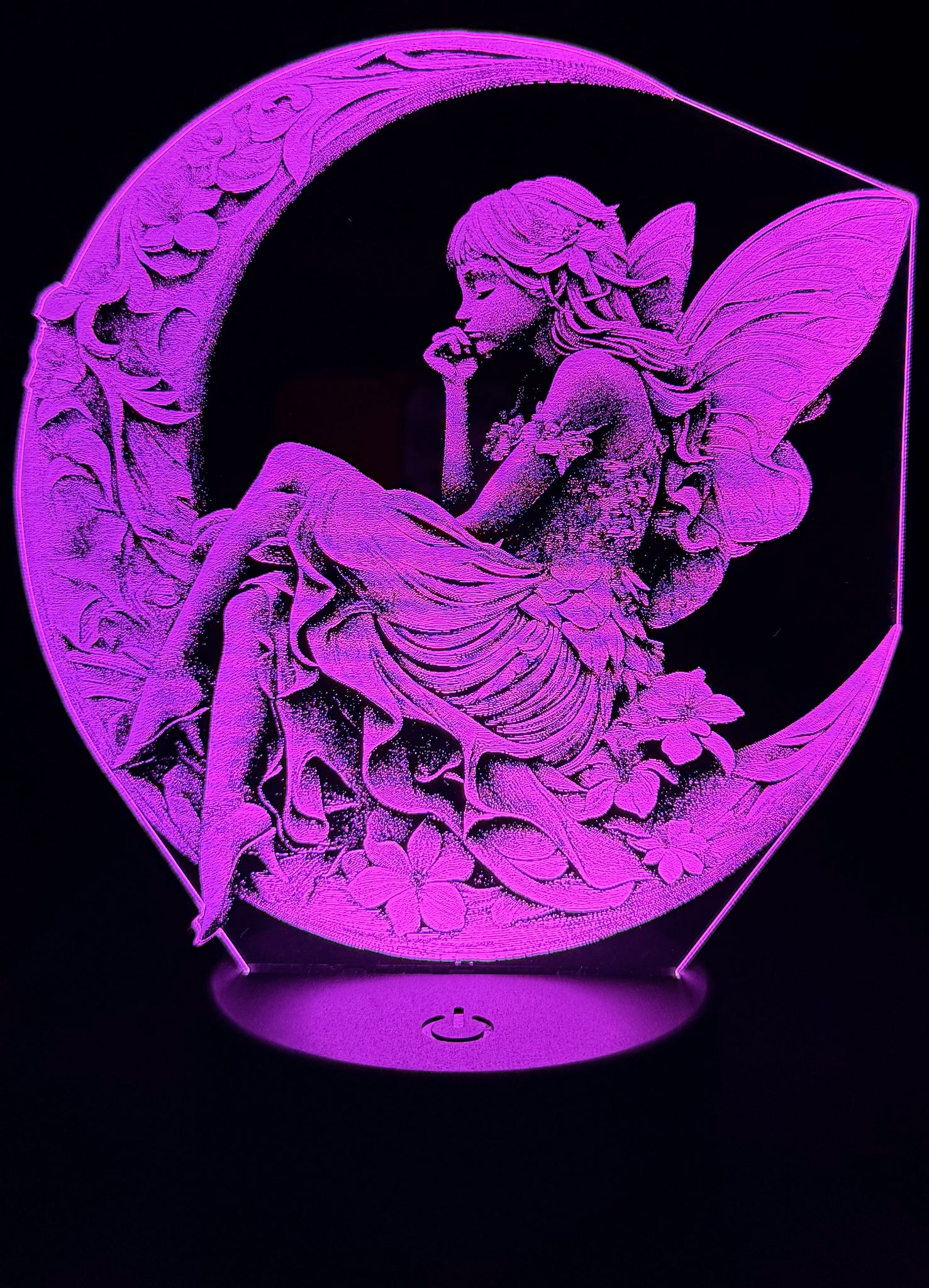 Let your space glow with enchantment. This edge-lit acrylic lamp features a delicately etched fairy perched on a crescent moon, surrounded by blooming florals and flowing foliage. Her wings shimmer with intricate detail, and the soft LED base brings the entire scene to life with a gentle, ambient glow.